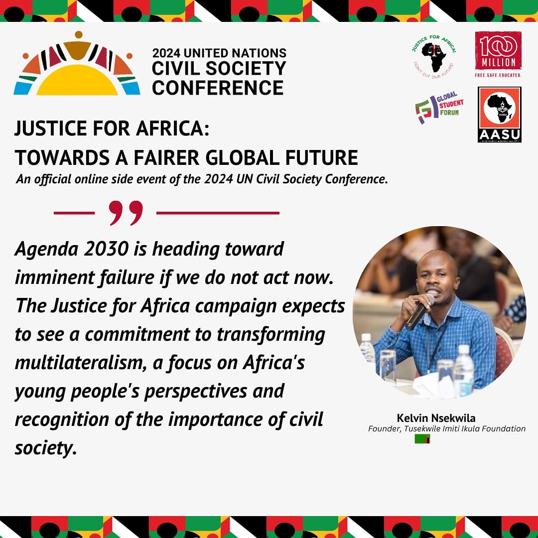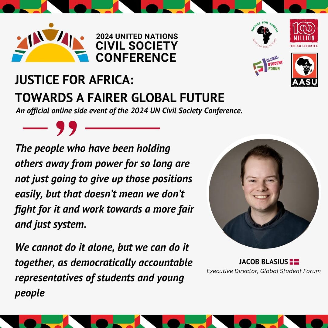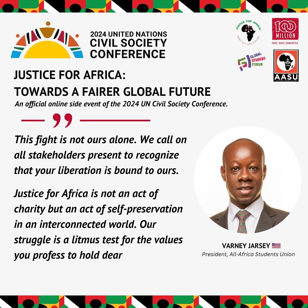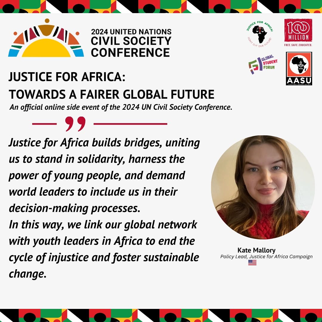 On May 8th, the official side event for the 2024 United Nations Civil Society Conference, Justice for Africa: Towards a Fairer Global Future took place online. The session was organised by Justice for Africa, a global campaign led by Africa’s students, youth and survivors of human rights abuses, with solidarity from their peers across the world, co-convened by the All-Africa Students Union, Global Student Forum and the 100 Million campaign.