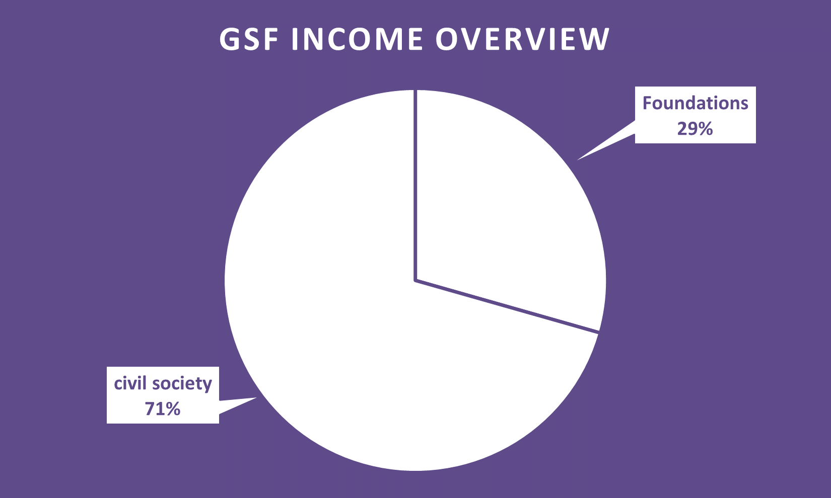 The distribution of the Global Student Forum's total income for the financial year 2022-2023 shows foundations accounting for 29%, while 71 % can be contributed to funding from civil society organisations.